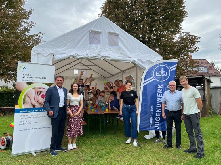 Die Kindersommerwoche (KiSoWo) des Evangelischen Jugendwerks Eislingen erfreut sich seit vielen Jahren großer Beliebtheit. In und um das Luthergemeindehaus werden auch in diesem Jahr 75 Kinder eine Woche lang mit vielseitigem Programm betreut. 25 ehrenamtliche Mitarbeiterinnen und Mitarbeiter planen, bereiten vor und betreuen die Kinder von der zweiten bis zur sechsten Klasse mit diversen Sport-, Spiel- und Bastelangeboten, unabhängig von ihrer Konfessions- und Religionszugehörigkeit. Da die Räumlichkeiten nicht für alle Kleingruppen ausreichen, wird zusätzlich im Garten des Gemeindehauses ein großes Zelt aufgebaut. „Das vorhandene Zelt ist in die Jahre gekommen, an einigen Stellen schadhaft und somit nicht mehr wasserdicht. Es wurde zudem schon mehrfach repariert, dies ist nun aber nicht mehr möglich und muss ausgetauscht werden. Aus Sicherheitsgründen muss es stabil und standfest sein und einen Bodenrahmen haben, damit es windsicher verankert werden kann“ berichtete Pfarrerin Ursula Pelkner bei der Antragstellung für das Evangelische Jugendwerk in der Vorstands- und Beiratssitzung der Stiftung im November letzten Jahres, bei der es um die Beschlussfassung der Spendenausschüttung ging. Einstimmig wurde beschlossen, dem Förderantrag und der Anschaffung eines neuen Zeltes in Höhe von 1.250 Euro zuzustimmen. OB Klaus Heininger hat als Beiratsvorsitzender der Stiftung die diesjährige KiSoWo besucht um sich Vor-Ort ein Bild von dem neuen Zelt zu machen. „Wir freuen uns, dass wir diese vorbildliche Jugendarbeit mit dem neuen Betreuungszelt unterstützen können. Damit wird auch das enorme ehrenamtliche Engagement bei der KiSoWo belohnt“, unterstreicht OB Klaus Heininger die Intention der Spende durch die Stiftung Alten- und Familienhilfe.